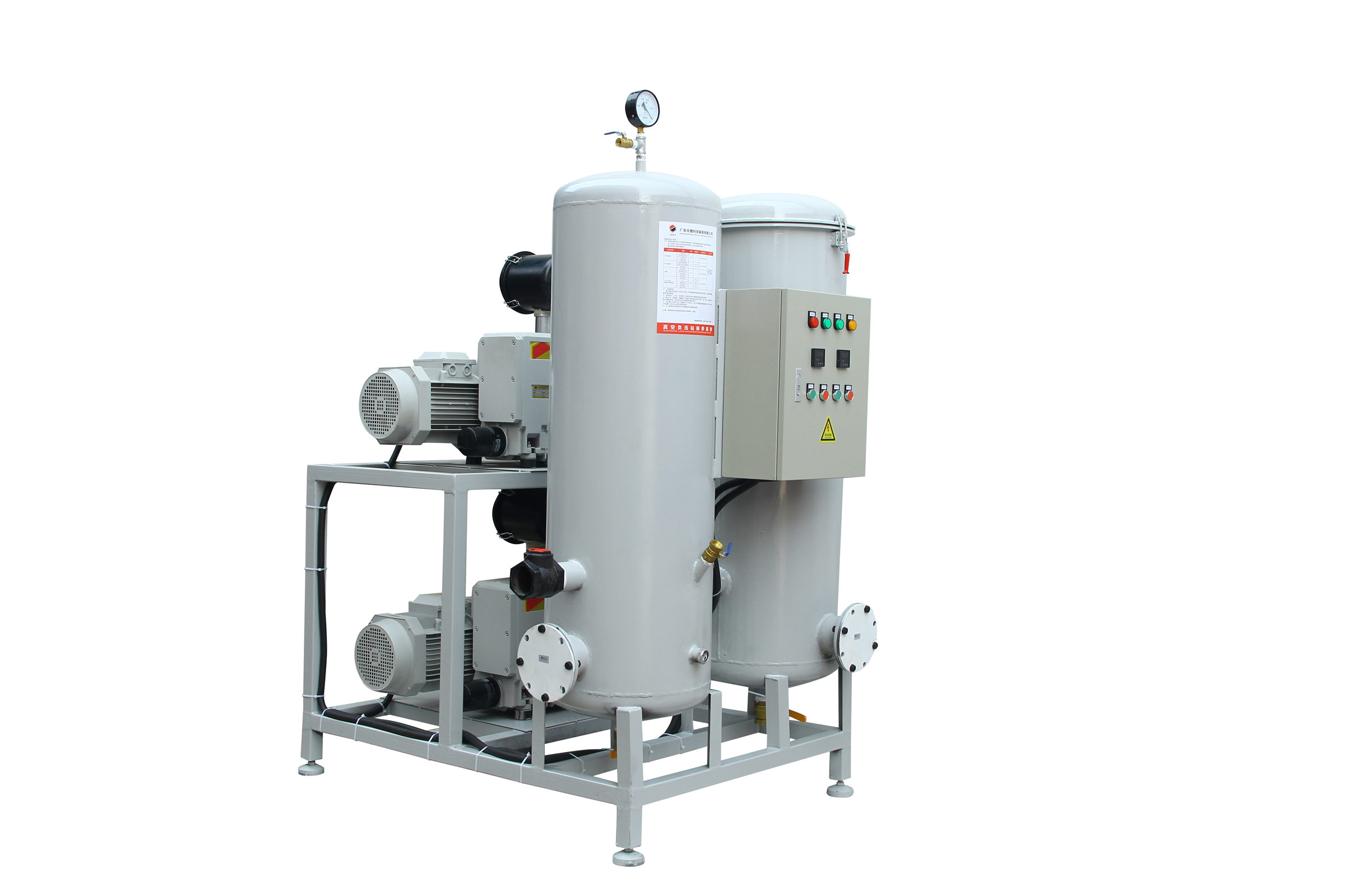 移動式真空負壓站一般包含真空緩沖罐、真空泵、控制制箱、冷卻卻器、真空附件、真空度報警系統;該系列負壓站包含兩種類型,即開放式真空負壓站和封閉式真空負壓站,客戶使用環境良好,操作簡單,成本要求嚴格,則可做開放式真空負壓站;客戶使用環境惡劣,有大量粉塵,可凝性氣體,腐蝕性氣體等環境,則做成封閉式。